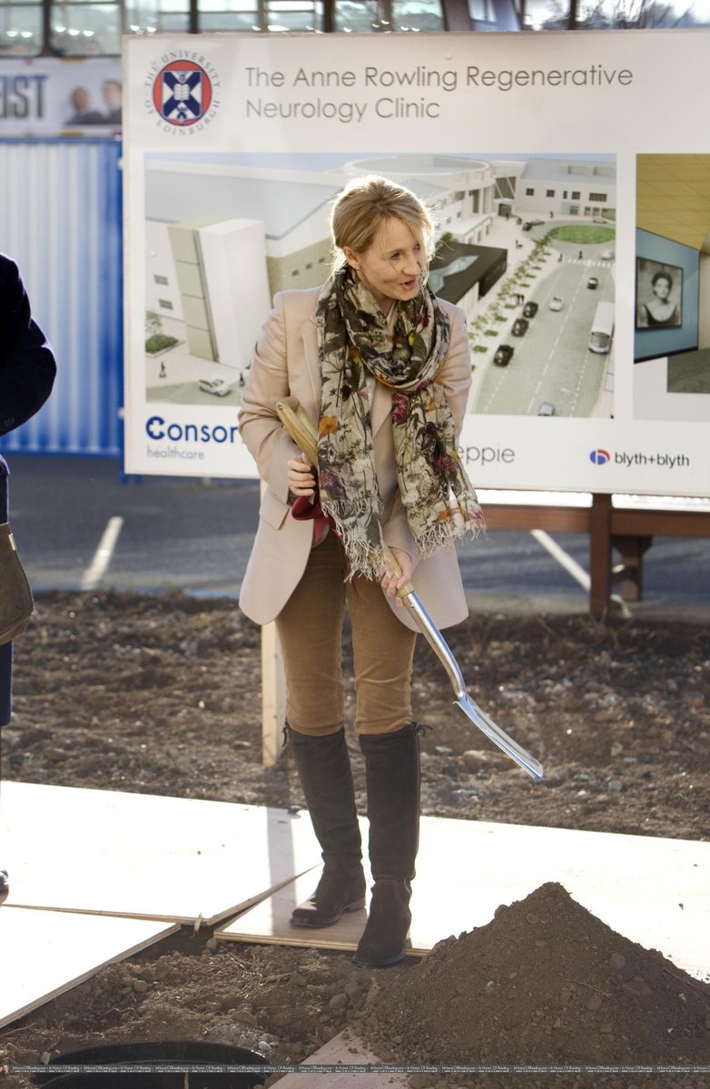 J.K. Rowling colocou a mão na massa enterrando uma cápsula do tempo em frente a construção da Clínica de Regeneração Neurológica Anne Rowling, em homenagem a mãe da famosa autora.
